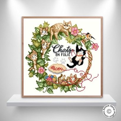 Découvrez "Chats en folie", un modèle de point de croix plein de malice ! Entre feuilles et pelotes, brodez la joyeuse pagaille de petits compagnons espiègles. Une création poétique et détaillée, disponible en fiche papier ou PDF pour vos moments créatifs