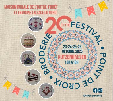 - Festival point de croix et broderie du jeudi 23 au dimanche 26 octobre de 10 h à 18 h à la salle des fêtes de Kutzenhausen (67)